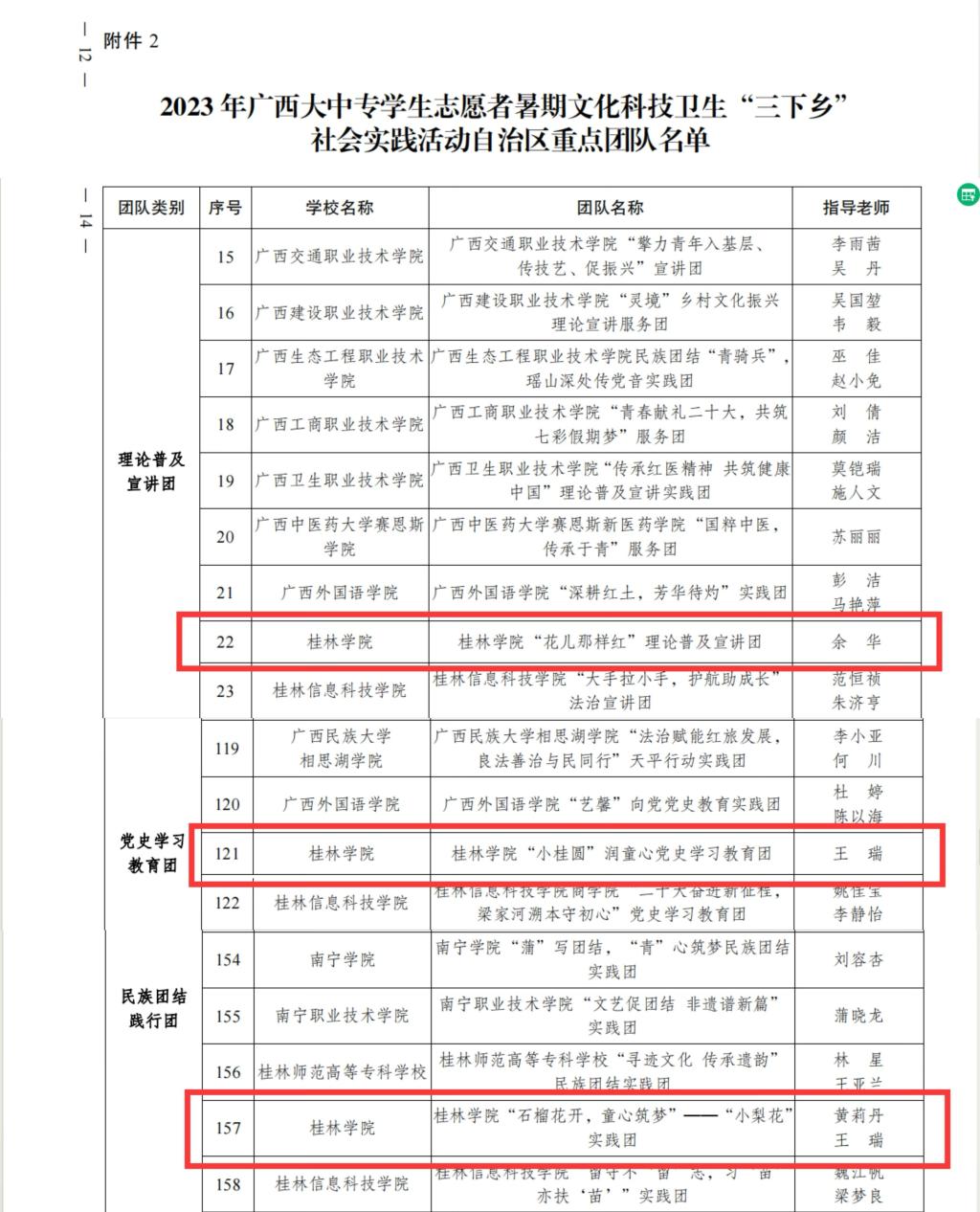 近日,自治区党委宣传部、自治区文明办、自治区教育厅、共青团广西区委、广西学联印发了《关于公布2023年广西大中专学生志愿者暑期文化科技卫生“三下乡”社会实践活动重点团队名单的通知》,经学校申报、材料审核、评议研究,最终评出2023年广西大中专学生志愿者暑期文化科技卫生“三下乡”社会实践活动全国重点团队68支、自治区重点团队200支。其中,我校“花儿那样红”理论普及宣讲团、“小桂圆”润童心党史学习教育团和“石榴花开,童心筑梦”──“小梨花”实践团被评为自治区重点团队。