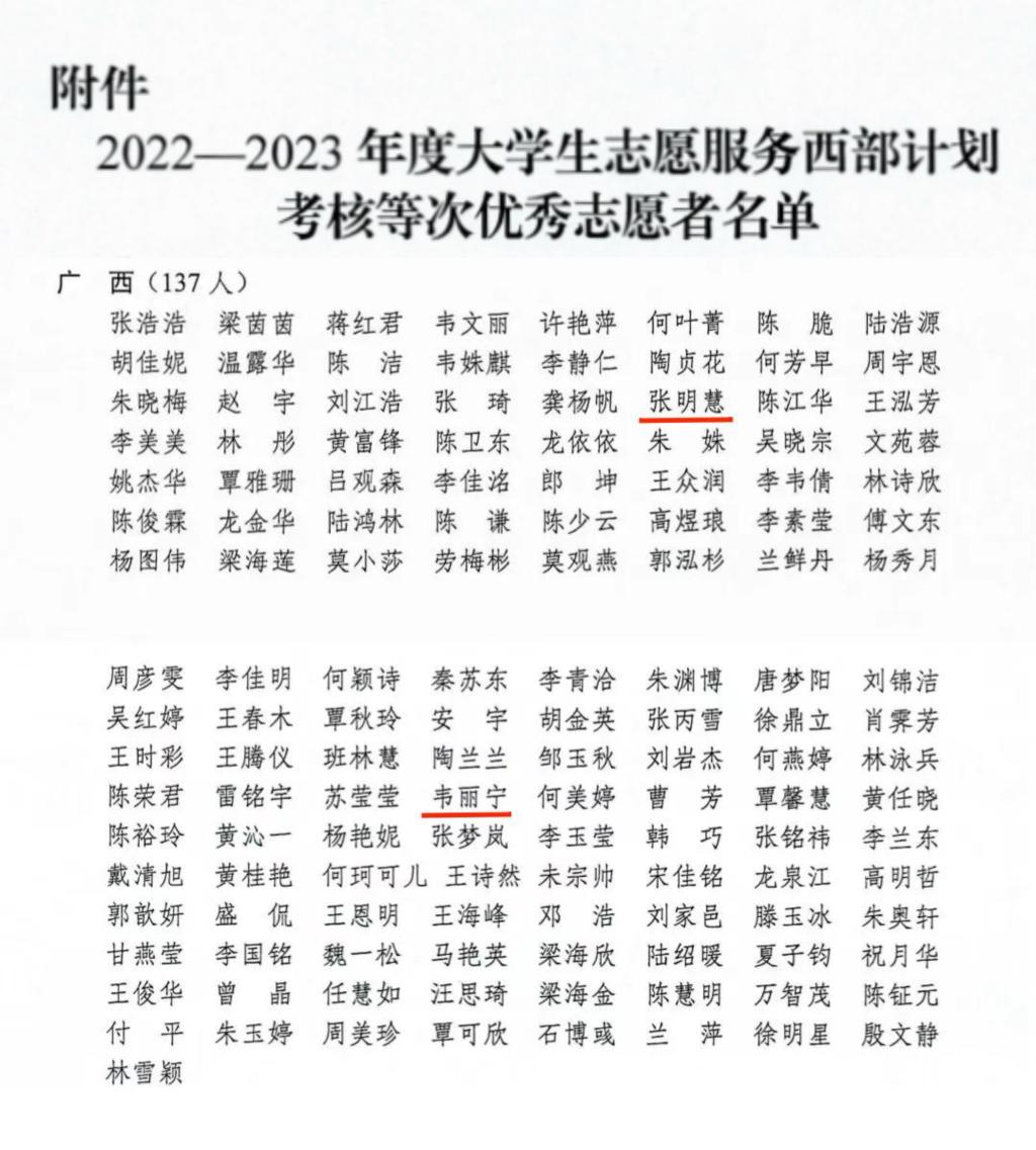 近日,全国大学生志愿服务西部计划项目管理办公室印发《关于印发2022-2023年度大学生志愿服务西部计划考核等次优秀志愿者名单的通知》,我校张明慧、韦丽宁2名西部计划志愿者获评全国2022—2023年度大学生志愿服务西部计划考核等次优秀志愿者。
