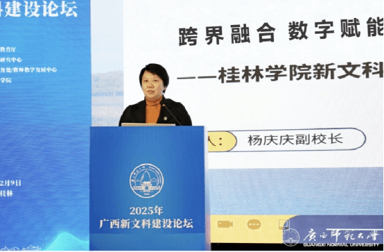 12月9日,“2025年广西新文科建设论坛”在桂林成功举办。本次论坛由广西壮族自治区教育厅指导、广西新文科教育研究中心主办、广西师范大学承办,吸引了全区30所普通本科高校的150余位代表参加。我校副校长杨庆庆率队出席了此次论坛。