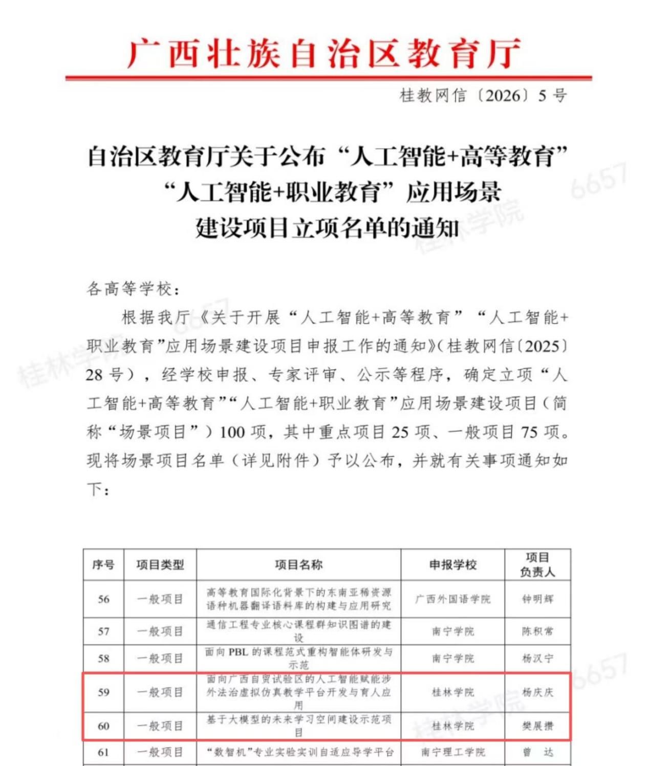 近日,自治区教育厅正式公布了《“人工智能+高等教育”“人工智能+职业教育”应用场景建设项目立项名单》。我校杨庆庆副校长主持申报的《面向广西自贸试验区的人工智能赋能涉外法治虚拟仿真教学平台开发与育人应用》和信息工程学院樊展攒老师主持申报的《基于大模型的未来学习空间建设示范项目》两项课题,凭借其前瞻性、创新性和扎实的前期基础,在激烈竞争中脱颖而出,获得“人工智能+高等教育”一般项目立项。