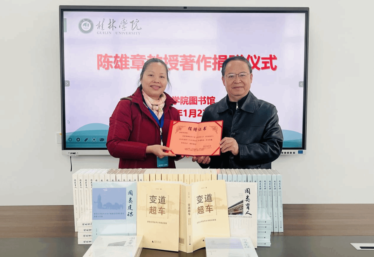 1月27日上午,图书馆在党建活动室举行了简朴而隆重的图书捐赠仪式。学校第一任分管教学副校长、南宁学院原副校长陈雄章教授将其近年出版的三部代表性学术著作《变道超车:新型应用技术大学建设探索》《因类育人——新型应用技术大学内涵建设讲演录》及《因类建课:新型应用技术大学产教融合型课程建设探索与实践》共计60册图书赠予图书馆,图书馆负责人、资源建设部全体老师参加了捐赠活动。