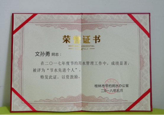2017年我校高度重视节水管理工作,积极创建“广西壮族自治区节水型单位”,加大节水宣传力度,改造节水设施设备,选用节能型节水器具,全年累计用水总量同比2016年减少了129578 m³,节约用水成绩显著,我校荣获2017年度桂林市节水先进单位,文孙勇同志被评为桂林市2017年度节水先进个人。