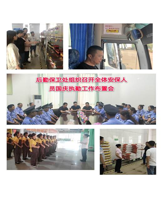 检查结束,后勤保卫处各条块分别就国庆期间的后勤保卫工作进行了再布置。如:食堂已备好了新鲜的食材,在国庆期间将有丰盛的饭菜供师生选用;车队、水电班、卫生所值班人员已全部安排就绪,做好随时服务师生的准备;安保人员努力消除各类安全隐患,确保校园安全稳定。