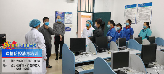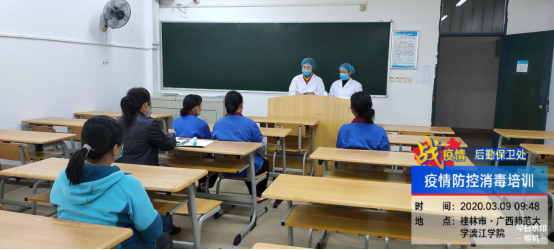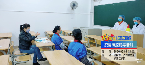 2020年3月9日上午,后勤保卫处组织医务人员开展校园环境清洁消毒培训工作。后勤保卫处副处长廖军兰、实验教学与网络信息中心副主任代国勇、桂林盛峰保洁绿化公司骨干人员参加了培训会。