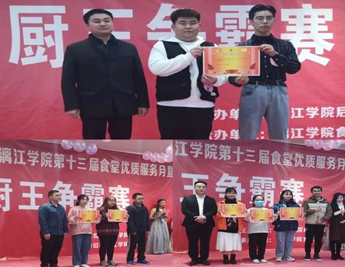 比赛现场,各具创意的团队展示引燃了全场的氛围,选手们制作出独具特色的精美菜品并提供给评委品尝,评委们根据成品菜的色感、形感、香感、味感、质感等综合方面进行了打分。经过一番评比,“我不是厨神”团队的参赛作品“红烧牛肉”以全场最高分荣获一等奖,“不服来挑战”“葱花香菜”团队荣获二等奖、“不二色彩”“吉祥四宝”“可可乐园”团队荣获三等奖。本次厨王争霸赛特别邀请食堂员工上台积极展示 “拉面绝活”和才艺表演环节,大赛的最后,与会嘉宾分别为前三名获奖团队颁发荣誉奖状,本次厨王争霸赛亦在浓烈的气氛中圆满结束。
