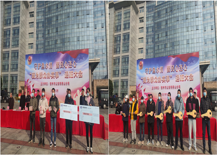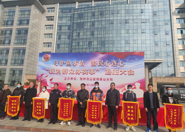 为深入学习宣传贯彻党的十九届六中全会精神,扎实推进“我为群众办实事”实践活动,回应人民群众新期待,展示公安机关打击违法犯罪工作成果,震慑犯罪,鼓舞士气,2021年12月21日上午,桂林市公安局雁山分局在雁山创业服务中心广场召开了“我为群众办实事”退赃大会,我校后勤保卫处秦家荣副处长、潘丞以老师、商贸与法律学院谭海练老师和30名学生代表参加了此次会议。