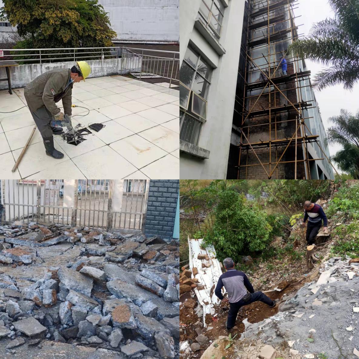 基建办公室组织人员对校园部分道路混凝土路面、嘉善楼外墙进行了翻新;食堂三角区部分围墙进行了重建;对广场和楼宇损坏地砖、部分楼宇漏水点、墙面腻子进行了修复;对东一、东二、东三、西一、西二五栋学生宿舍入户门及阳台纱网进行了更换;至善楼斜屋面原油毡瓦更换成了树脂瓦;对部分楼宇一楼下陷台阶进行了修复;对西一漏水自来水管进行了修复。