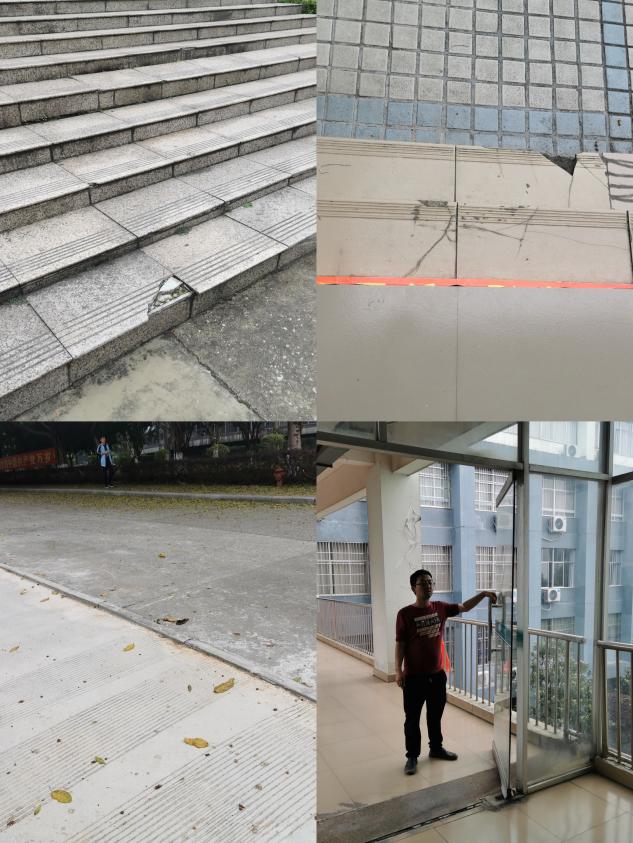 检查组对校园内外各种建筑物和基建设施存在隐患的场所进行逐一检查,基建人员发现彰善楼、乐善食府台阶地砖损坏、聚善广场人行道路沿石不平整、至善楼二区三楼玻璃门损坏等问题,已列入维修计划。