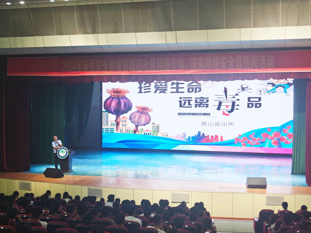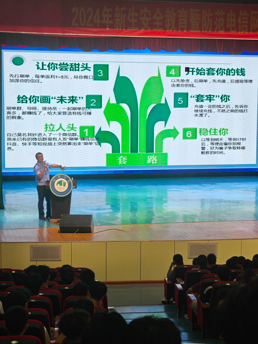 9月7-8日,学校后勤保卫处会同学生事务处(部)在弘善讲堂精心策划、组织开展了新生“大学生安全教育”主题讲座,内容涵盖防范电信诈骗、网络安全、消防安全、交通安全、远离邪教、抵制毒品等方面。本次讲座特邀雁山公安分局刑事侦查三队大队长李灵希,雁山镇派出所副所长张辉祥来校主讲,旨在帮助新生树立安全理念、提高安全意识、提升防范技能。各二级学院分管安全稳定工作负责人、新生辅导员、后勤保卫处相关人员、2024级全体新生认真听取了讲座。