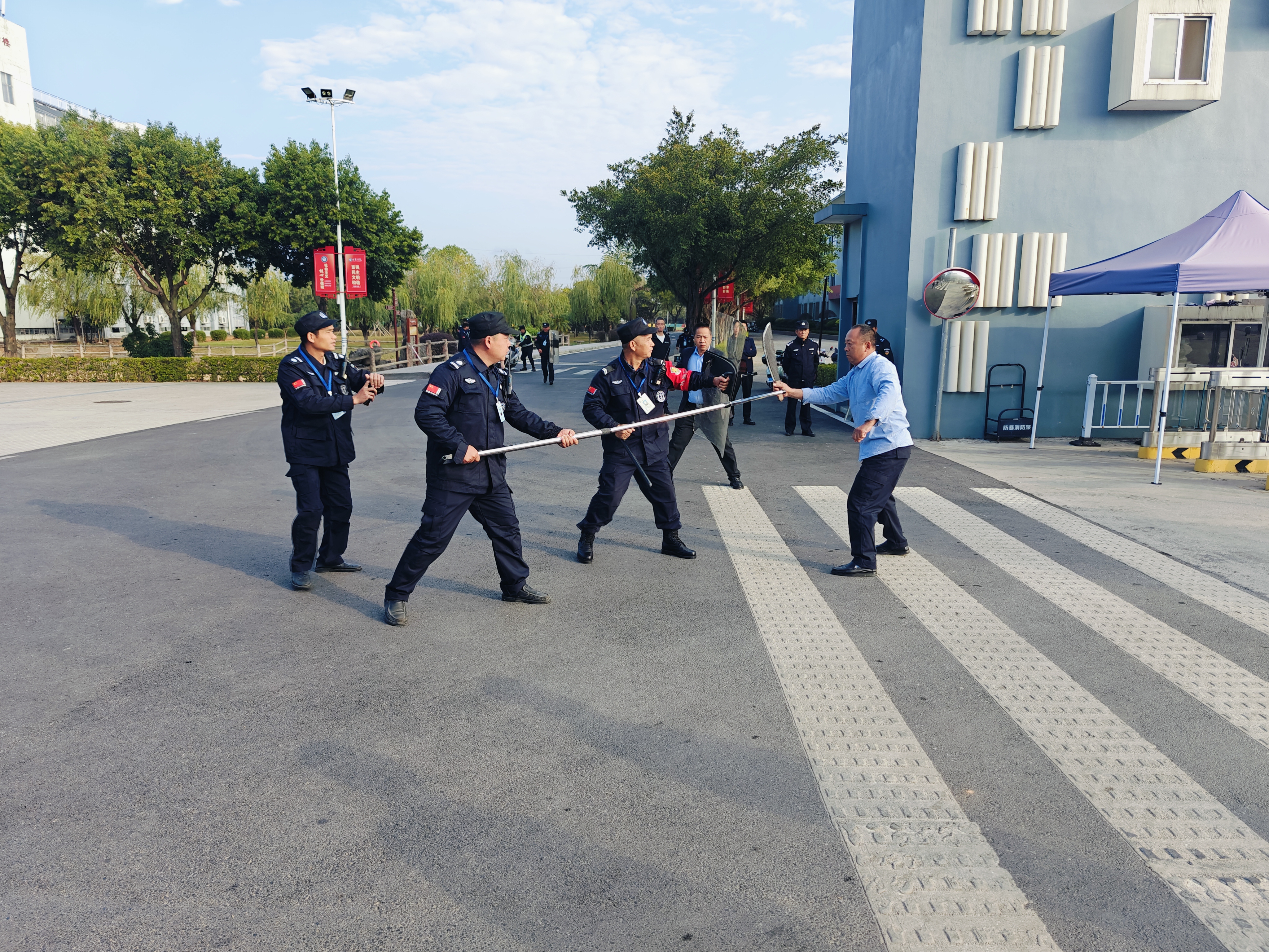 在演练开始前,后勤保卫处组织安保人员进行了详细的部署和培训。现场模拟“暴恐分子”强行闯入校园环节,保安人员迅速反应,立即启动反恐防暴应急预案。保安人员手持防暴器械,在最短的时间内赶赴现场,并建立现场警戒线,防止无关人员进入现场,与“暴恐分子”进行对峙。他们熟练地运用防暴盾牌、钢叉等器械,形成了一道坚固的防线,成功将“暴恐分子”制服,解除了危机。