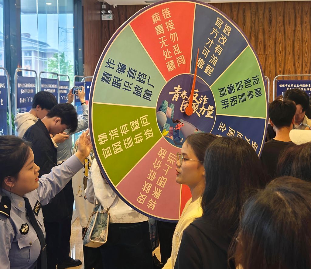 活动场外还设置了“反诈游戏区”,吸引了众多青年驻足参与,互动过程中,同学们热情高涨,欢声笑语间进一步提升了反诈意识与实践应对能力。此次活动让同学们学习了丰富的反诈知识,了解了防诈反诈技能,他们将投身桂林反诈事业,贡献青春力量。