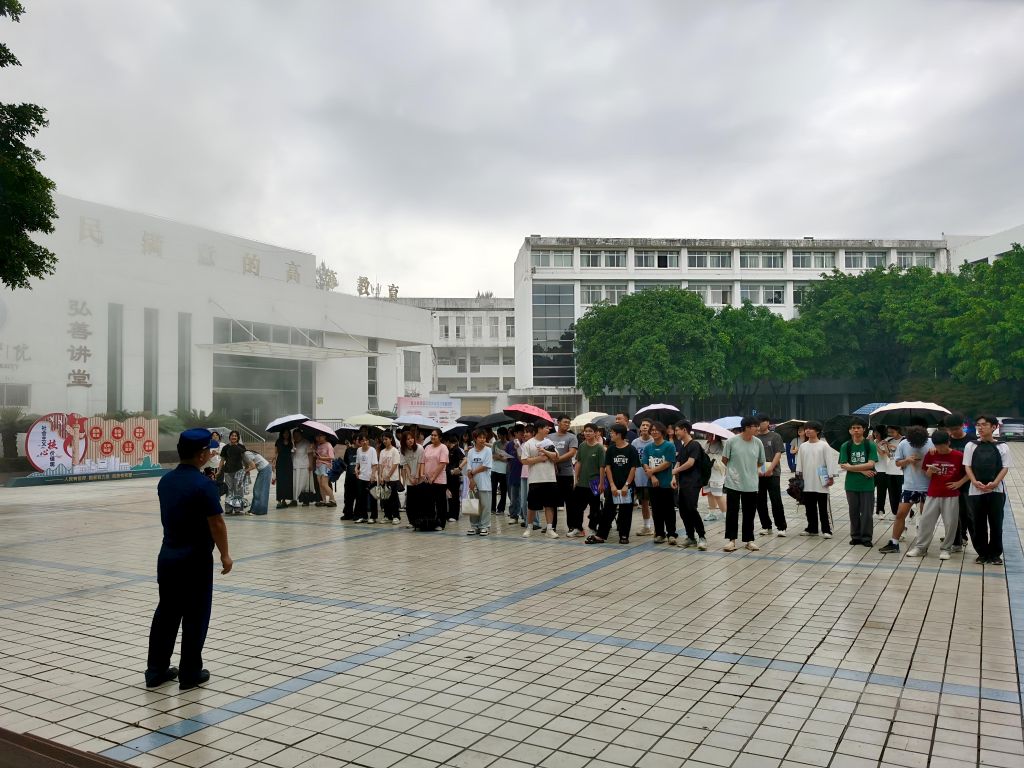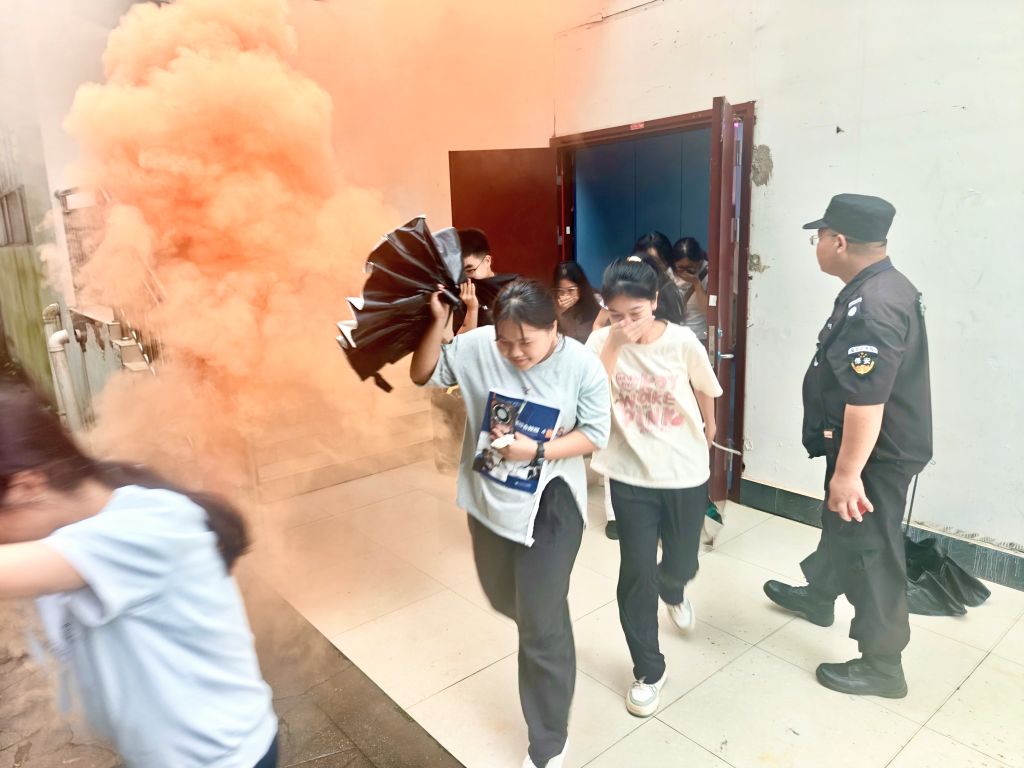 在模拟火灾事故逃生演练中,随着“火灾”警哨声响起,同学们按有条不紊地逃离“火灾现场”。疏散过程中,同学们采取低身捂鼻姿势有序撤离,远离火源和烟雾点疏散,快速、有序地疏散到安全区域。