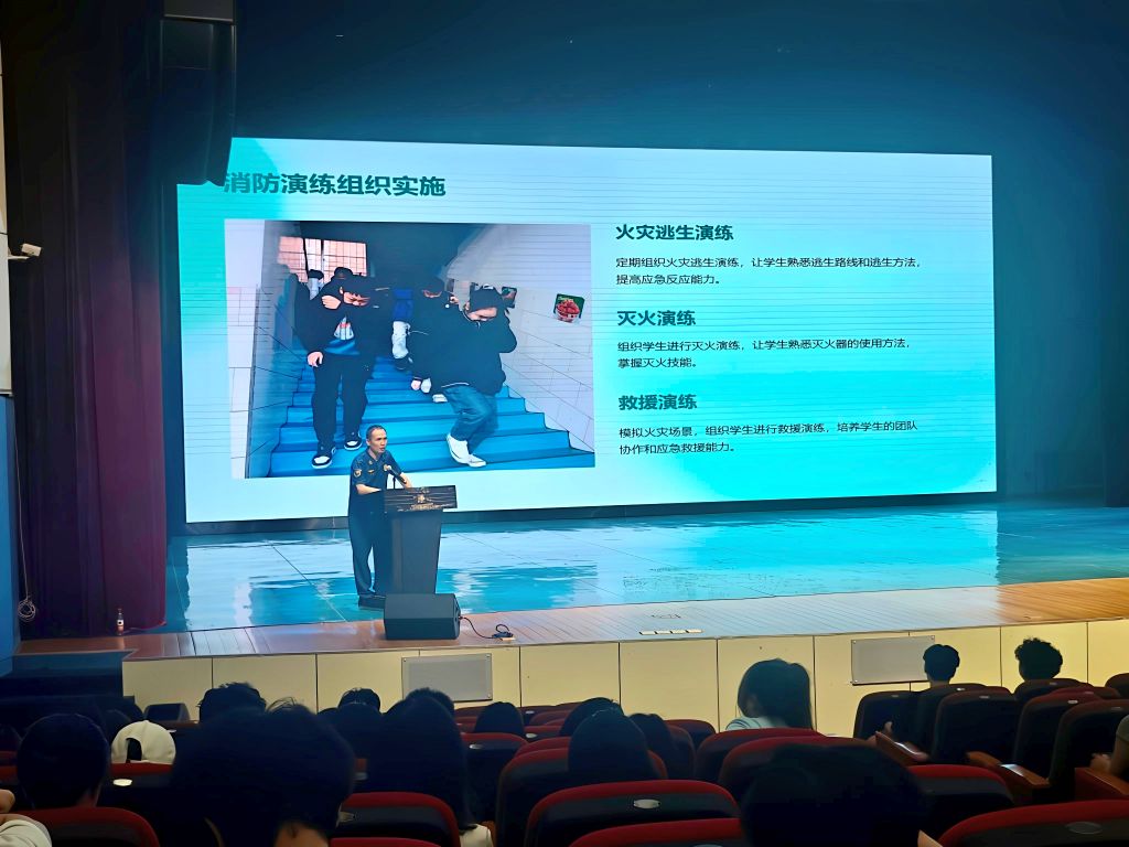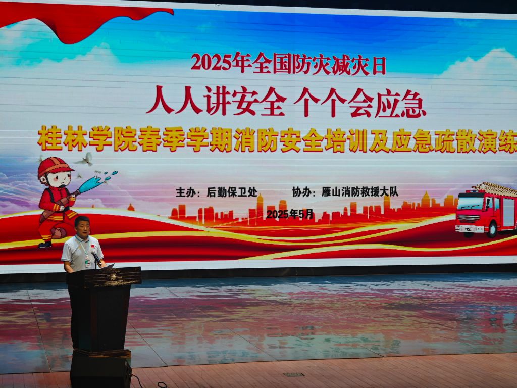 为了深入贯彻落实防灾减灾救灾工作的重要精神,增强我校大学生群体的消防安全素质和应急自救能力,5月15日,我校在弘善讲堂开展春季学期消防安全培训及应急疏散演练。雁山区消防救援大队何有双参谋应邀到场指导活动,后勤保卫处有关负责人、各二级学院学生代表500余人参加了此次活动。