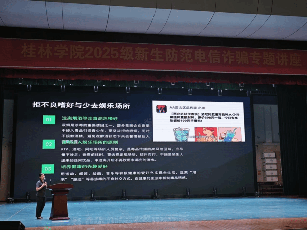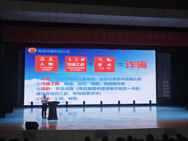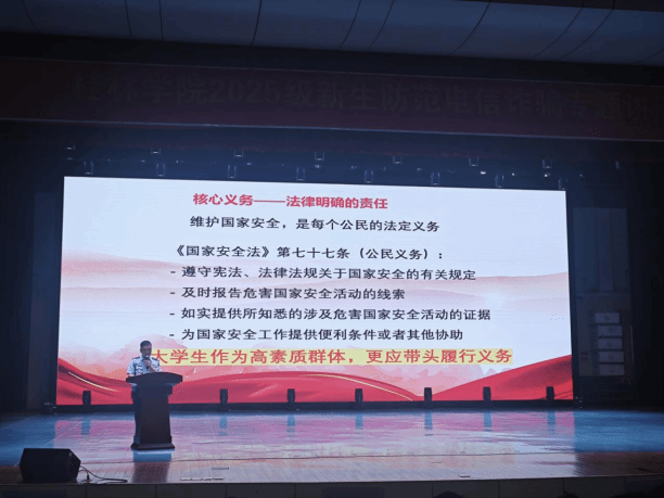 9月12日晚上,为了让2025级新生深刻理解法治精神,增强法治观念,提升法律素养,扣好大学生活的“第一粒法治纽扣”,由雁山区委政法委、雁山区法学会联合团区委、公检司法、卫健局等部门联合打造的“开学法治第一课”来学校开讲。来校授课的老师都是“平安雁山讲师团”成员,他们主要围绕禁毒、防诈、国家安全、反邪教、防艾五大主题,结合工作实际,与同学们分享了日常学习生活中容易遇见的案例和防范手段,深入浅出地阐述了法治精神、剖析了校园内外常见法律风险、指明了大学生应遵循的行为规范和法律底线。
