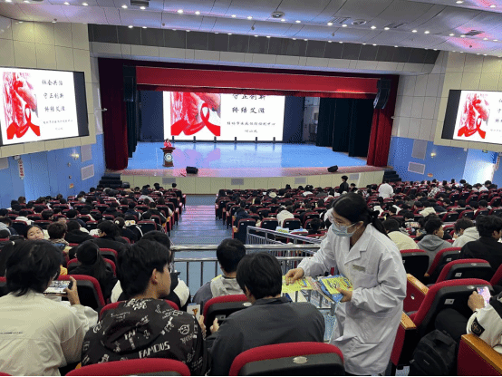 讲座现场,校卫生所的医护人员为同学们发放了防艾知识手册和秋冬季常见传染病防控知识宣传小册子,提供了实用的健康指导。