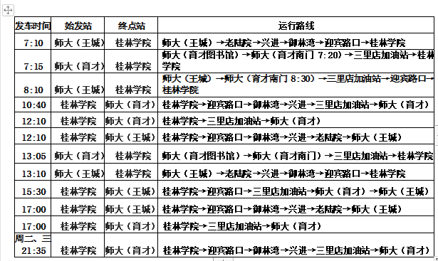 一、取消8:10(师大王城--师大育才--桂林学院)、10:40(桂林学院--师大育才)、15:30(桂林学院--师大育才--师大王城)、21:35(桂林学院--师大育才)班次,其余车次不变,具体详见校车运行时刻表。