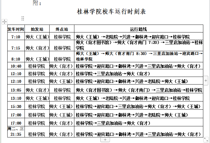 一、取消8:10(师大王城--师大育才--桂林学院)、10:40(桂林学院--师大育才)、15:30(桂林学院--师大育才--师大王城)、21:35(桂林学院--师大育才)班次,其余车次不变。具体详见桂林学院校车运行时刻表。