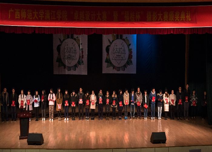 为增强设计学生的实践能力,切实提高学生的应用能力,经过前期精心筹划,由漓江学院艺术设计系主办的首届“卓越设计大赛”暨“福桂杯”摄影大赛颁奖典礼,12月28日晚在我院多功能报告厅隆重举行。漓江学院党委副书记邓志平老师,漓江学院副院长刘林海老师,桂林福桂纸业有限公司董事长银福忠先生,漓江学院学工处副处长戈铁胜老师,艺术设计系主任、书记以及部分老师代表和各年级学生代表等参加了此次颁奖典礼。