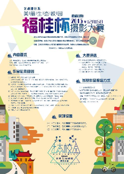 本次摄影大赛由桂林福桂纸业有限公司的赞助,围绕“美丽生态校园”为主题,以新视角真实呈现漓江学院校园生态环境的现状,内容可包括校园风光之美、环境改造批评(纪实)、学习生活与生态环境、环境人文情感等方面,漓江学院全体在校大学生均可报名参赛。参赛摄影作品风格题材不限,最后评选由专家评审组采取投票方式进行,设置一二等奖与入围奖,并对获奖学生颁发奖金、奖杯及证书。此次大赛将持续到12月15日,具体参赛事宜可到艺术设计系咨询。