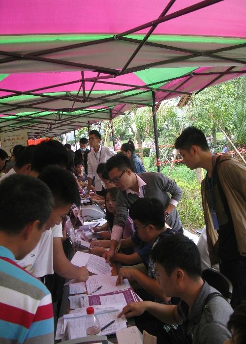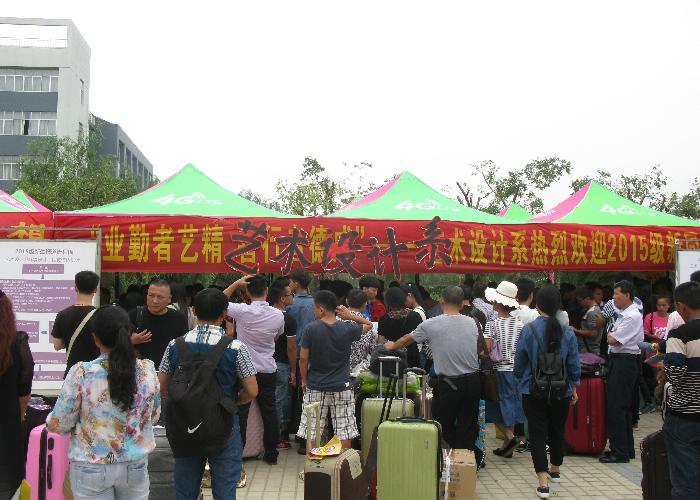图一:艺术设计系迎新大本营前来报到的2015级新生和家长络绎不绝