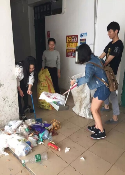 同学们在清理宿舍楼倒垃圾