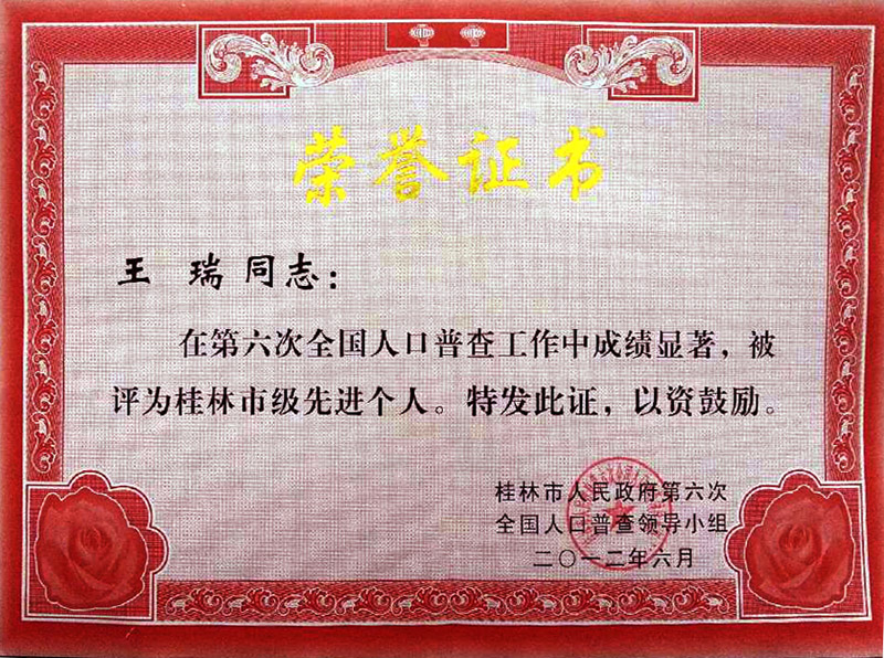 喜讯:艺术设计系王瑞老师荣获桂林市第六次全国人口普查先进个人