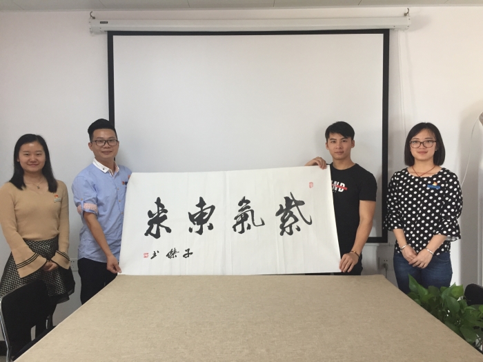 王瑞副书记代表艺术设计系向王扬辉、刘佳两人赠送了曾子杰主任的墨宝,祝福公司事业蒸蒸日上,开创更好的成绩。王瑞副书记在座谈中说到,作为老师,很高兴能够看到学生在社会上取得不俗成绩。校友就像艺术设计系的一张名片,希望校友通过自身的言行向社会宣传艺术设计系,宣传漓江学院。同时,希望校友们能常回母校看看,为学校今后的发展献计献策。