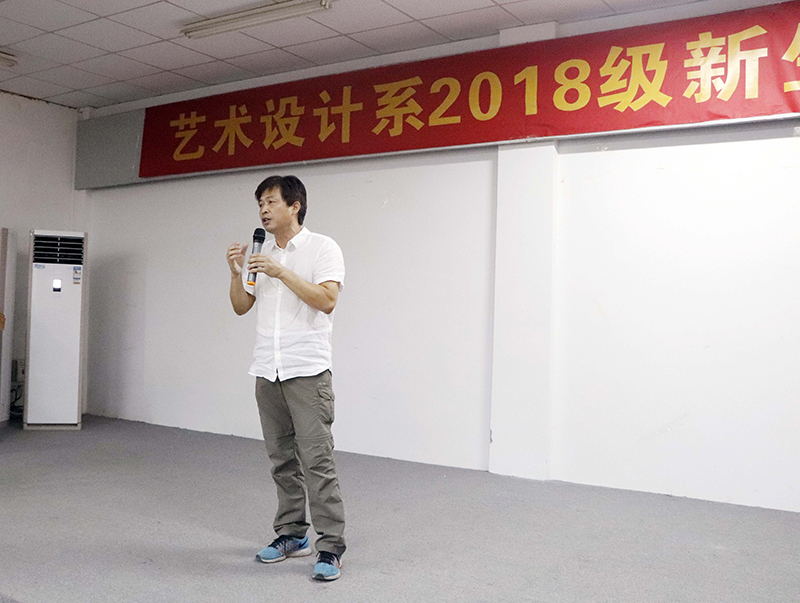 在慷慨激昂的国歌声中,艺术设计系师生见面会拉开了帷幕。首先由艺术设计系主任曾子杰致辞,他对2018级“小鲜肉”的到来表示热烈欢迎,并提醒大家“江湖水深,脚下谨慎”,切莫荒废大学四年的生活,学会做人做事,认真学习,多参与实践活动,促使自己变得更加优秀。