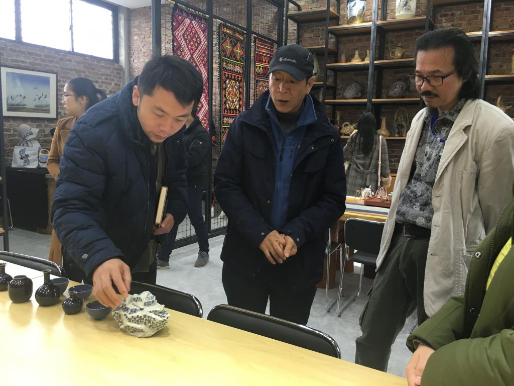 艺术设计学院院长韦剑华、党总支书记邓振锋、副院长郭敦辉等相关领导热情接待了考察团,并进行了情况介绍。韦剑华院长带领考察团参观了纤维印染工作室、陶艺实验室、综合工艺工作室、大学生创新创业基地等校内科研与实训基地,并详细介绍了学院以学生就业为导向而构建的“工学交替”、“角色交叉”的“双导师工作室制”人才培养模式以及校企合作、产教融合高素质应用型人才的发展道路。实地考察结束后,双方领导及教师代表开展交流座谈,围绕党建工作、专业建设、人才培养方案、双导师制度、实验实训室管理等内容开展交流,并就新时代如何提升高校育人质量进行了工作探讨。