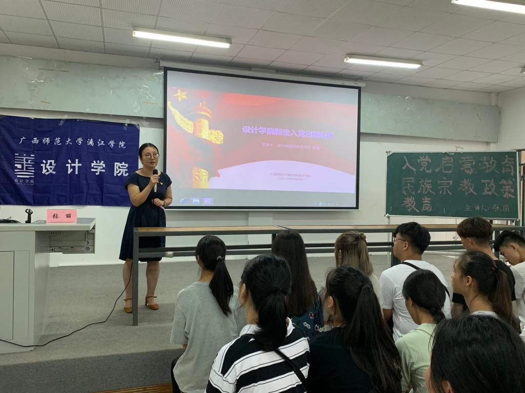 9月10日上午,设计学院在嘉善楼132教室开展2019级新生入党启蒙教育讲座,讲座由设计学院党总支书记张丽主讲,设计学院党总支副书记陈玉婵、辅导员邱胜昇以及2019级全体新生聆听了讲座,。