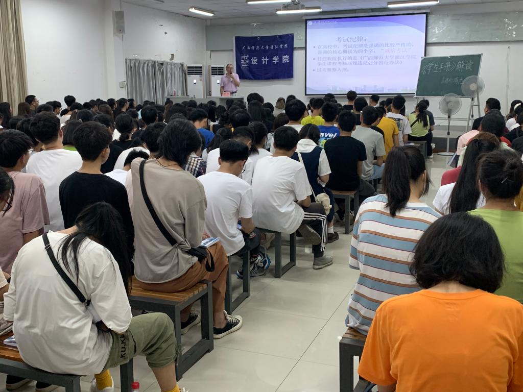 “不以规矩无以成方圆”,为帮助新生顺利安全的度过大学生活,9月10日晚,设计学院在132教室进行2019级新生《学生手册》导读讲座, 党总支副书记陈玉婵、辅导员邱胜昇以及2019级全体新生到场参加,讲座由教育与音乐学院党总支书记周杰老师主讲。