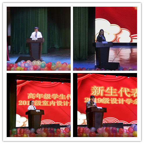 2019级设计学类专业学生余晖杨代表新生发言。他号召新生培养良好的习惯从现在做起,从小事做起,学会坚持,学会反思,刻苦钻研,不辜负父母和老师的期望。