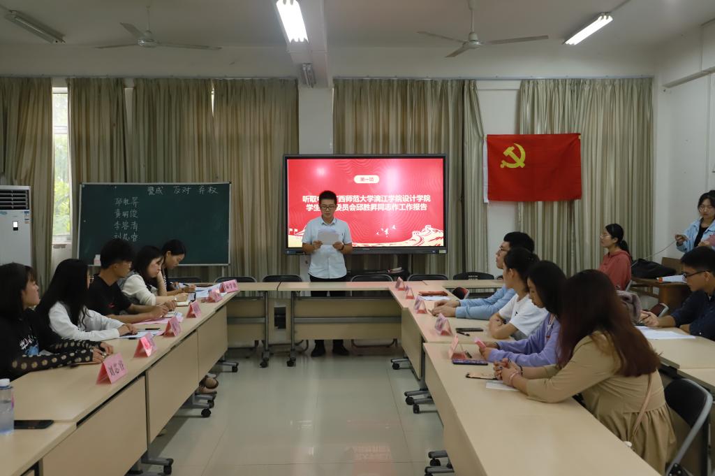 换届大会主要分两项议程。一是审议学生支部委员会工作报告;二是选举产生中共广西师范大学漓江学院设计学院学生支部委员会委员。学生党支部书记邱胜昇同志代表设计学院学生支部委员会向大会作报告。他在报告中提到:“党支部从2019年换届以来,一直努力探索创新、典型的理论学习内容和实践活动,融入学生党员喜闻乐见的形式,结合专业知识和个人特长,展现党员的先锋模范的带头作用。”