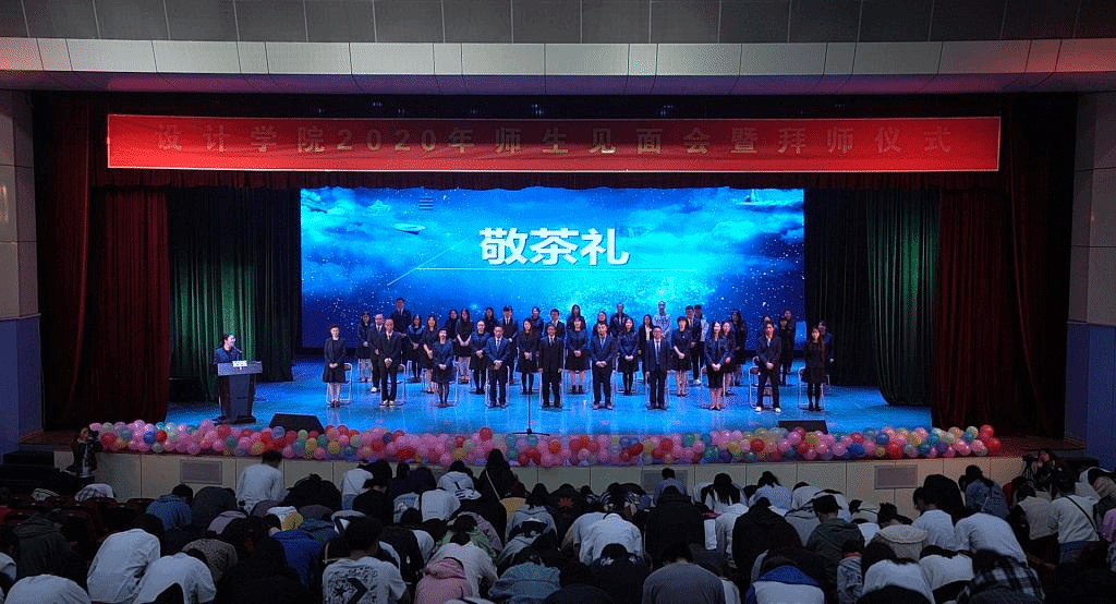 师生见面会开始,设计学院全体老师逐一亮相并依次为新生送上寄语。“今天的每一份努力都会换来未来丰厚的回馈”、“做我的学生,让我来宠你”、“江湖水深、脚下谨慎”、“种一棵树最好的时间是十年前,其实是现在”…老师们的寄语或简短、或深情、或幽默,但每一句寄语都充满了老师对新生的关爱和嘱咐。拜师仪式环节,新生代表上台逐一向老师们敬茶,老师们向新生回赠了勤学礼。276名新生全体起立,集体向老师鞠躬并整齐说到“老师,您辛苦了”!