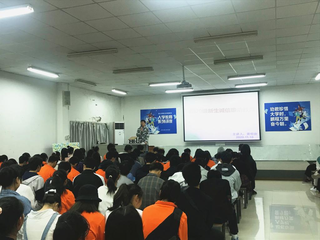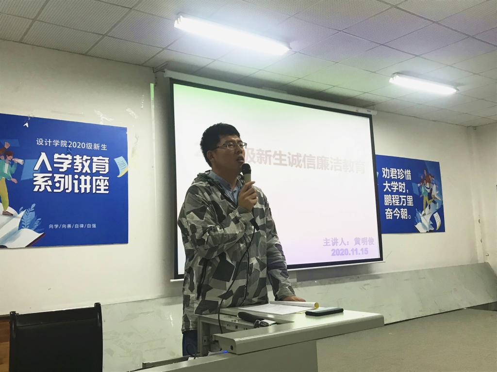 11月15日下午,设计学院在嘉善楼132教室举行新生诚信廉洁教育讲座,本次讲座由2020级辅导员黄明俊老师担任主讲人,全体2020级同学参加本次讲座。