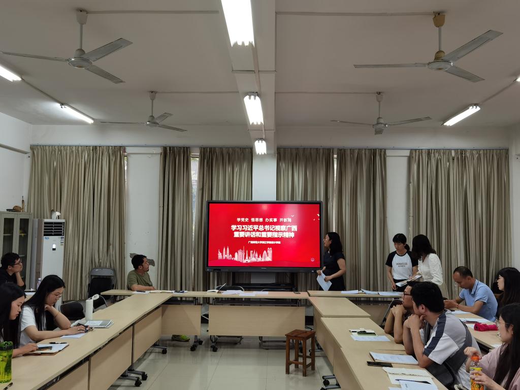 5月27日上午,设计学院组织全院教职工在嘉善楼213会议室开展政治理论学习,深入学习习近平总书记视察广西重要讲话精神。