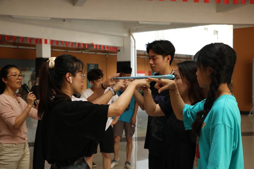 活动分为三个环节,环环相扣。第一个环节,同学们自由组队后确定队名,然后以萝卜蹲的游戏开启热身活动。同学们在放松的同时也加强了对彼此的了解。第二个环节为竞技环节,通过无敌风火轮、齐眉间两个团体活动,同学们在合作中实现共赢,深刻体会到团结的力量。第三个环节为学生分享环节,就活动过程表达自己的感受。