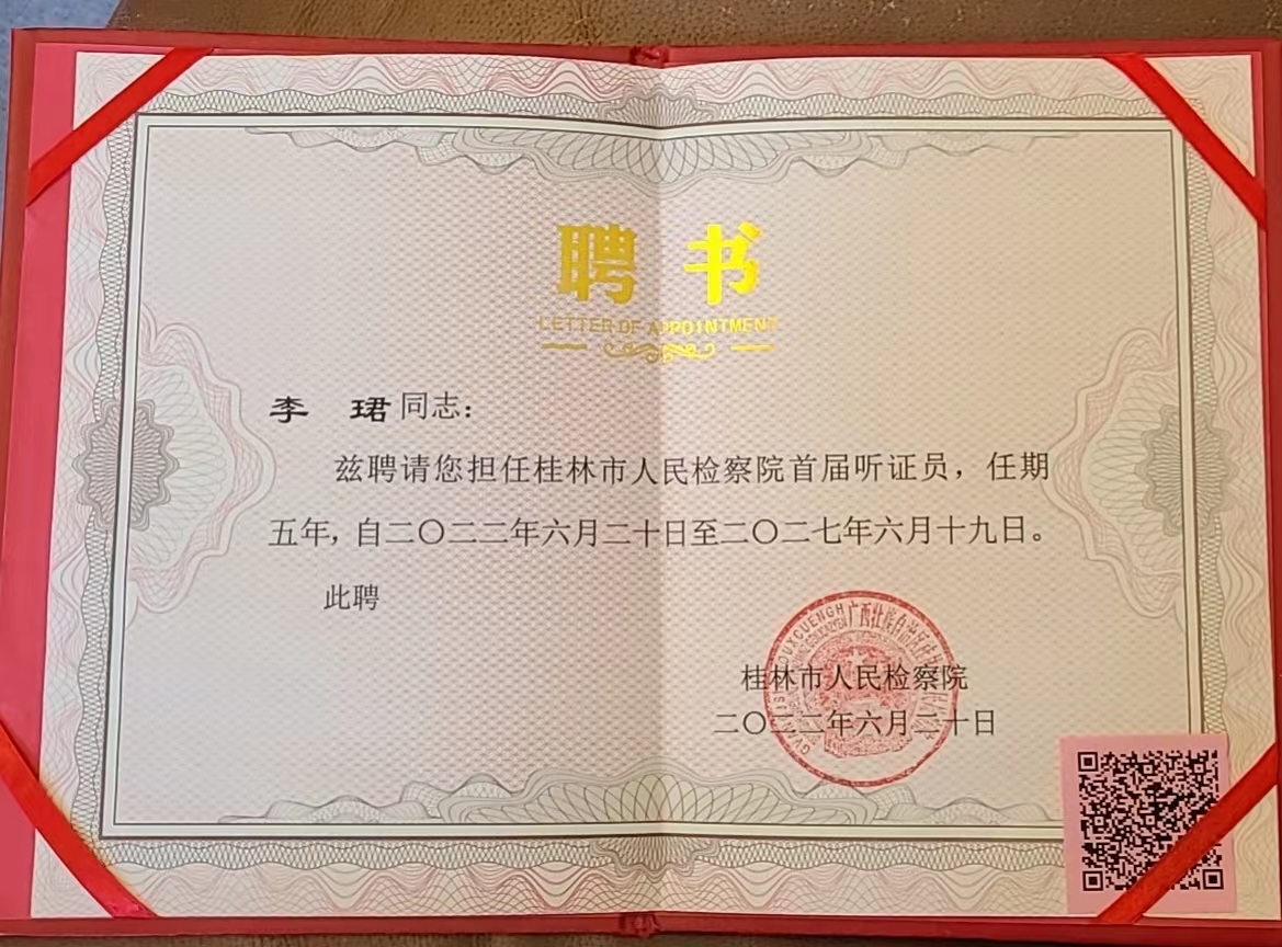 李珺老师担任桂林市人民检察院首届听证员聘书