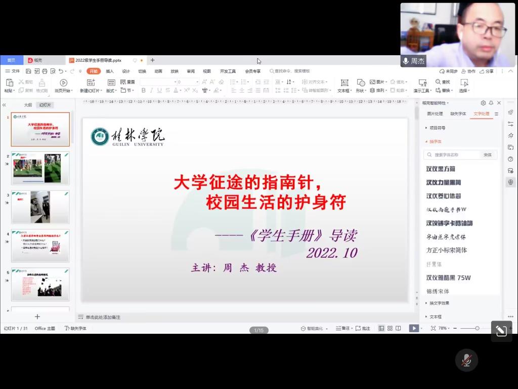 为了营造良好的学风氛围,维持良好的校园秩序,切实促进教学质量的提高,10月10日下午,设计学院利用腾讯会议客户端举行新生《桂林学院学生手册》解读讲座,本次讲座由教育与音乐学院党总支书记周杰主讲,设计学院2022级全体新生参加了本次讲座。