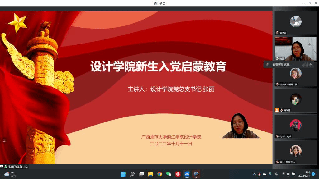 为做好2022级新生入党启蒙教育,增进新生对党的认识,引导新生积极向党组织靠拢,端正入党动机,10月11日下午,设计学院利用腾讯会议客户端开展线上入党启蒙教育及民族宗教政策宣传专题讲座。本次讲座由设计学院党总支书记张丽担任主讲人,2022级全体新生参加了本次讲座。
