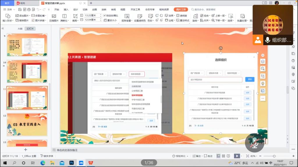 为加强学院与新生团支部的联系,提高团务工作效率,推进基层团组织规范化、科学化、信息化水平建设,10月11日晚,设计学院开展2022级新生线上智慧团建宣讲。活动邀请到设计学院团总支学生会组织部部长罗鑫利主讲,设计学院2022级全体新生参会。