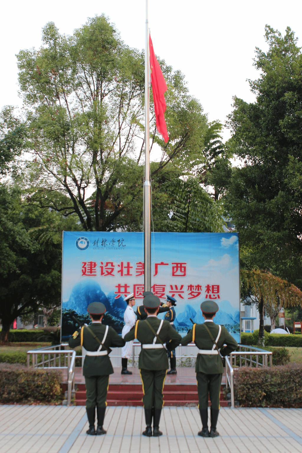 6点50分,国旗班着装整齐,踏着铿锵有力的步伐,护着鲜艳的五星红旗入场举行升旗仪式。在全体成员的注目礼下,伴随着激昂雄壮的国歌声,全体师生唱国歌、行注目礼,鲜艳的五星红旗迎风飘扬,冉冉升起在桂林学院的上空。