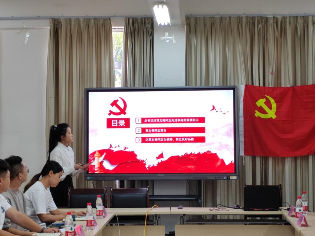 支部成员诸葛恒谈到黄文秀同志的先进事迹,就是党员干部的一面镜子、一个标杆、一盏明灯,是一名共产党员本色的体现,她身上的榜样力量,永远值得我们广大师生学习,书写不愧于时代、不愧于人民的青春之歌。
