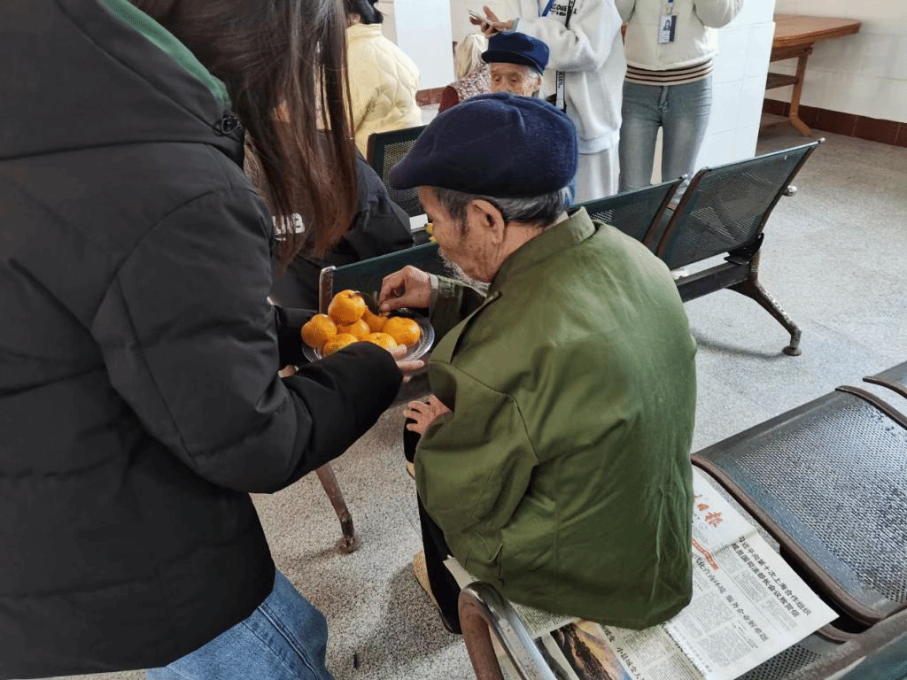 志愿者给老人们分享水果