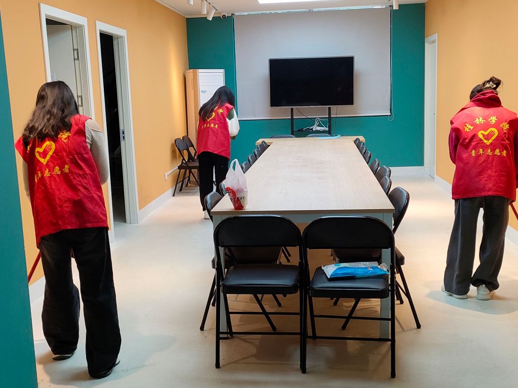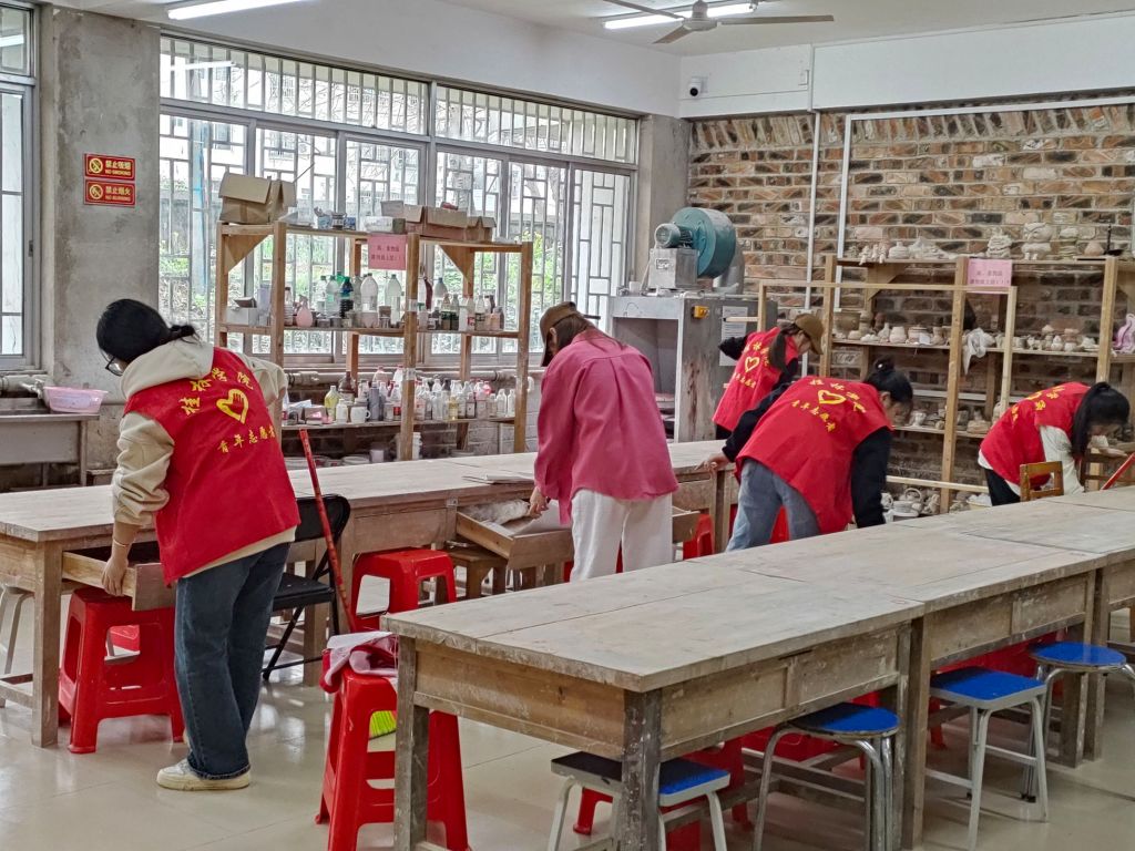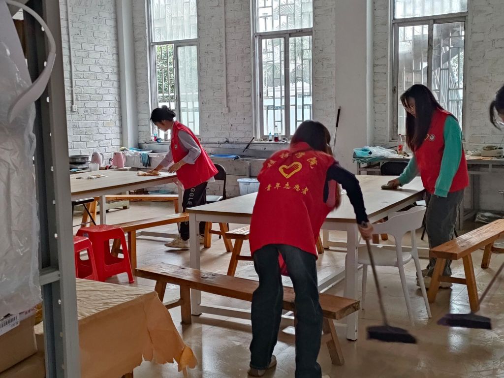 志愿者在打扫陶艺工作室