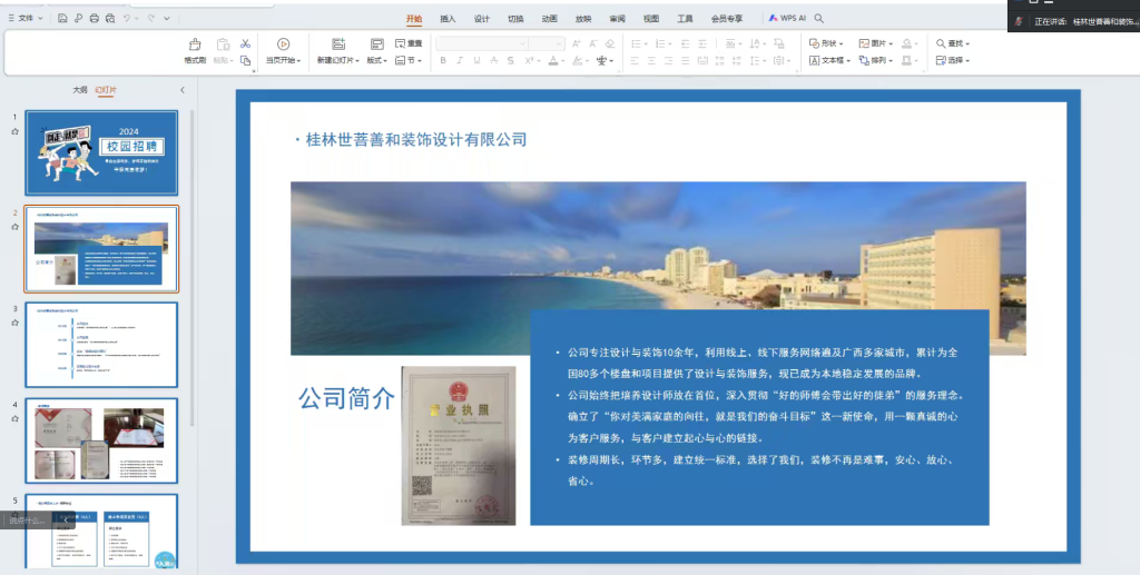 为进一步深化校企合作,促进毕业生更加充分、更高质量就业,5月5日晚,城市设计学院在腾讯会议平台召开毕业生就业专场宣讲会,宣讲会由桂林世菩善和装饰有限公司负责人张弢主讲,2024届毕业生辅导员刘永涛及全体环境设计专业毕业生参会。