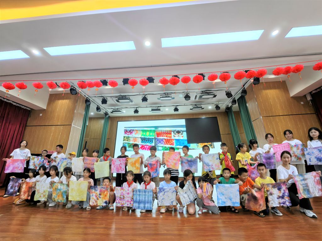 活动现场,竹编画的精巧、扎染的斑斓、漂漆扇的雅致、纸浆画的创意,四大非遗传统技艺悉数亮相,为师生们呈现了一场视觉与文化的盛宴。工艺美术专业的师生们精心策划,司淑娴通过生动的讲座与直观的操作演示,她谈到非遗传统手工艺的历史渊源、文化意义以及如何将非遗技艺的精髓融入现代生活,同时她将非遗技艺的精髓娓娓道来,让大埠中心校的小朋友们在轻松愉快的氛围中,不仅学习了非遗技艺的基本概念与独特价值,更亲身体验了这些古老艺术的魅力。