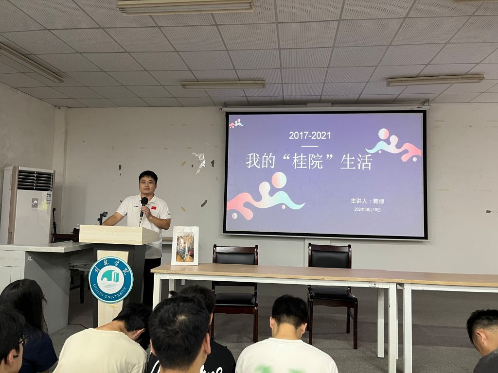 9月10日,城市设计学院在嘉善楼132教室开展“我的桂院生活”讲座,由学院辅导员韩博、教学秘书齐明涛主讲,2024级新生参加讲座。