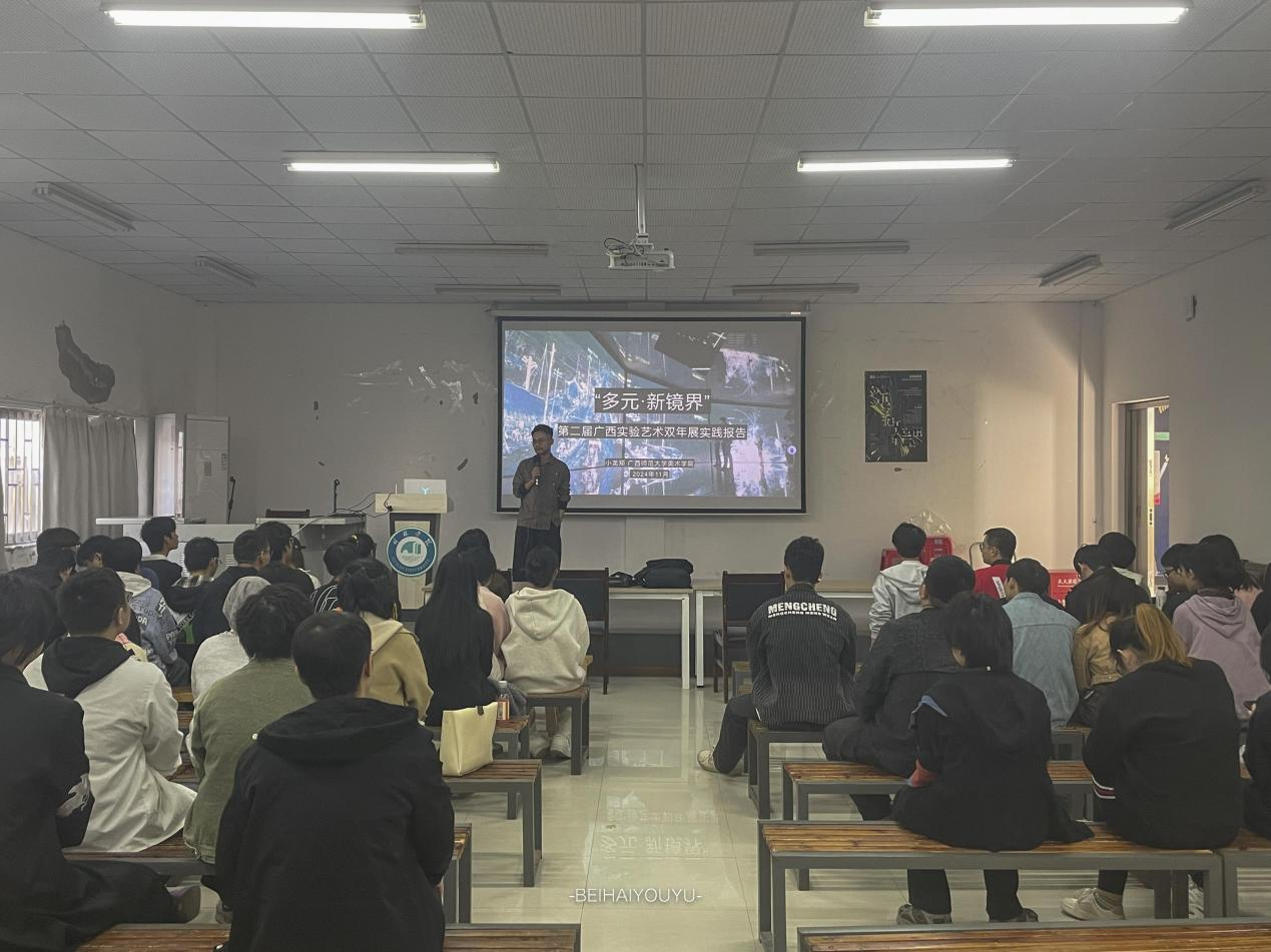 郑小龙作为“第二届广西实验艺术双年展实践分享”项目的策展团队成员与设计师之一,他在讲座中分享了展览的主题理念及策划背后的故事,旨在论述如何策划与呈现高质量的展览,并围绕征稿与评审、视觉设计、展陈与宣传等展览的关键环节展开讨论。讲座中,郑小龙引导学生深入思考与理解展陈与设计如何提升观众的视听体验,利用大量实验艺术作品案例激发学生对艺术创作中互动元素的兴趣,鼓励学生将艺术设计创作与展览策划实践相结合,并运用到未来就业的实践中。