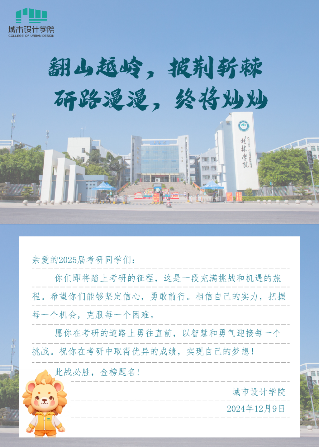 在考研的关键冲刺阶段,12月16日下午,城市设计学院为即将踏入硕士研究生入学考试的同学们开展“冬日有回音,沿途有温情”慰问活动,送上冬日里的关怀和祝福。